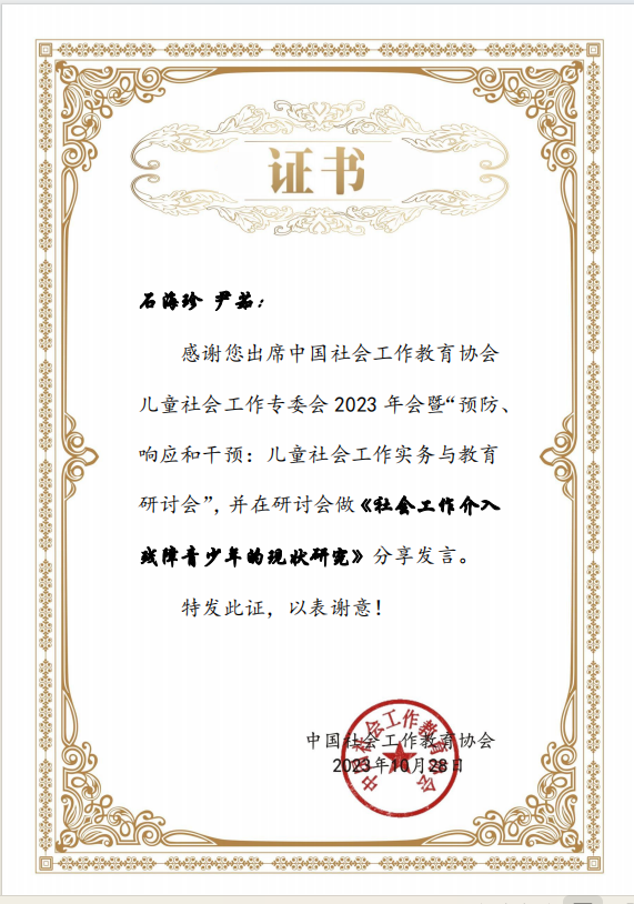 2023年10月28日-29日,中国社会工作教育协会2023年年会分论坛“预防、响应和干预:儿童社会工作实务与教育研讨会”暨2023年“中国社会工作教育协会儿童社会工作专委会年会”于湖南长沙举行。鲸鱼体育直播 2022级硕士研究生石海珍提交的论文“社会工作介入残障青少年的现状研究”入选会议论坛并获邀参会发言。