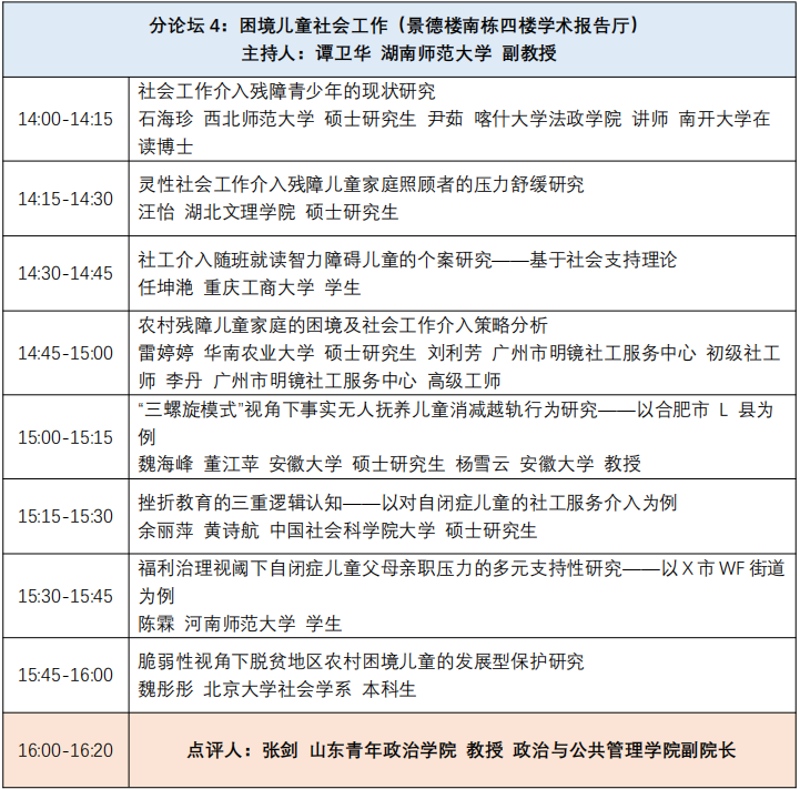 在研讨环节中,研究者们围绕“儿童社会工作理论与政策”“未成年人保护体系”“机构与社工站儿童社会工作”“困境儿童社会工作”“涉罪/未成年人司法社会工作”“留守儿童社会工作”“儿童心理健康与特殊行为问题的社会工作干预”“家庭视域下的儿童社会工作、儿童福利机构社会工作”“儿童青少年成长主题的社会工作”九个议题进行了积极热烈的研讨。石海珍同学在分论坛4进行汇报发言,基于残障青少年的生理、心理、社会特征,对残障青少年面临的困境以及困境产生的原因进行分析,将在个案工作、小组工作、社区工作和个案管理方面的研究进行了综述,最后剖析了社会工作在残障青少年领域发挥巨大作用的原因。山东青年政治鲸鱼直播 教授、政治与公共管理鲸鱼直播 副院长张剑作为论坛点评人,对论文进行了深入细致的点评,提出了宝贵的建议,最后各分论坛点评人总结及回报研讨成果。