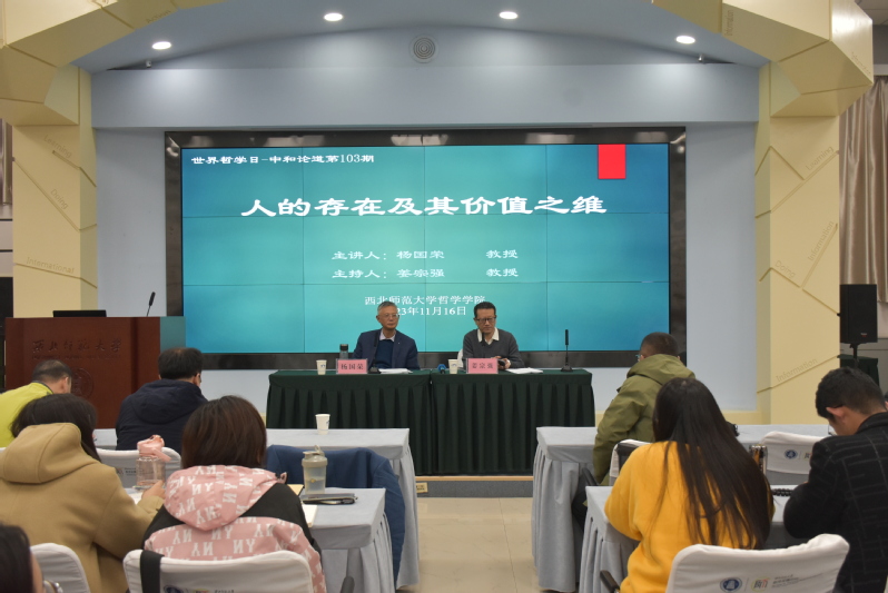 2023年11月16日晚,由西北师范大学哲学鲸鱼直播 、中和集团、科学研究院以及教师发展中心联合主办的“中和论道”第103期在教师发展中心举行。本期讲座主题为“人的存在及其价值之维”,由我校国家级高层次人才讲座教授、华东师范大学哲学系杨国荣教授主讲,哲学鲸鱼直播 院长姜宗强教授主持。西北师范大学、兰州大学、甘肃省委党校、兰州理工大学、兰州交通大学等院校的师生及哲学爱好者约150余人,现场聆听了杨老师的讲座。