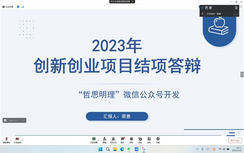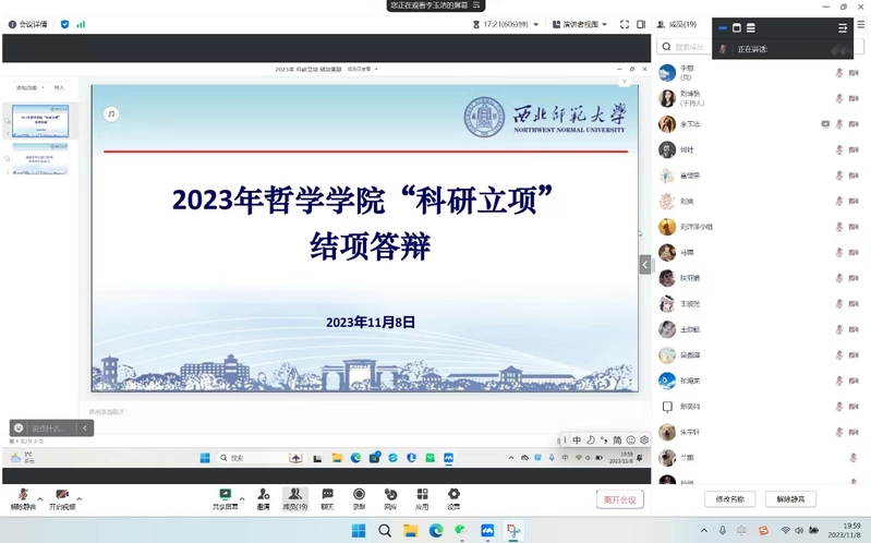 11月8日晚,哲学鲸鱼直播 2023年科研立项结项答辩在腾讯会议举行,共两个方向15个小组的同学参与了此次答辩,哲学鲸鱼直播 张海龙老师、孙玥老师担任评委。