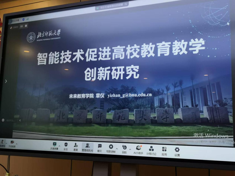 章老师围绕主题,首先从教育技术的发展与转型方面,对国内外的教育技术发展历程、特征和现状作了介绍,对未来人工智能、大数据、云计算等新兴技术对未来教育的可能变革进行了讨论。其次围绕智能技术与高校教学有效融合,从技术支持及Mentimeter、Padlet、Kahoot、微助教等在线互动工具的使用方面,作了经验分享和讲解。最后章老师从自己的专业出发,围绕教学案例、教育教学文章撰写与发表等内容进行了分享和讨论。