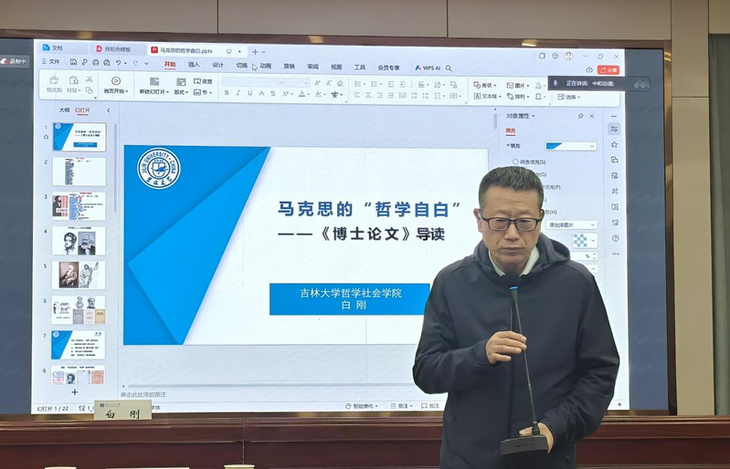10月31日,“中和论道”第113期在鲸鱼直播 4楼报告厅举行。本次讲座的主题为“马克思的‘哲学自白’——《博士论文》导读”,由吉林大学哲学社会鲸鱼直播 院长白刚教授主讲,鲸鱼直播 党委书记姜宗强教授主持,马克思主义鲸鱼直播 马乔恩教授、鲸鱼直播 王珅副教授参与与谈。讲座吸引了校内外诸多师生线上、线下热情参与。
