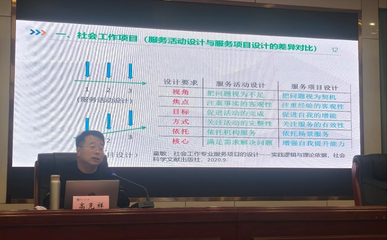本次讲座主要从社工专业与社工职业的再认识;社工项目与项目策划书的再思考;真实需求与需求回应的再理解;设计思路与设计策略的再融合这四个部分围绕展开。讲座初始,高老师讲述了在做项目中重要的是“钱”,如何通过短短几页项目报告去得到项目资金是我们做项目的关键,也进一步印出了我们应该如何去做。