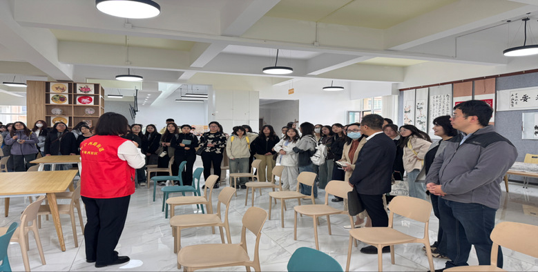 随后,李萍副书记带领师生实地参观社区长者食堂,枣林西社区现有60岁以上老年人达3113人,占比26.9%。为满足老年人就餐需求,社区与甘肃桐槿格食品有限公司合作,利用二楼场地和刘家堡派出所现有厨房,打造幸福兰州长者食堂。这里不仅是饱腹之所,更成为邻里温情的传递站。师生们还参观了社区党委办公区、居民办事大厅、活动场地等,对社区完善的设施和贴心的服务有了进一步鲜活生动的认知。