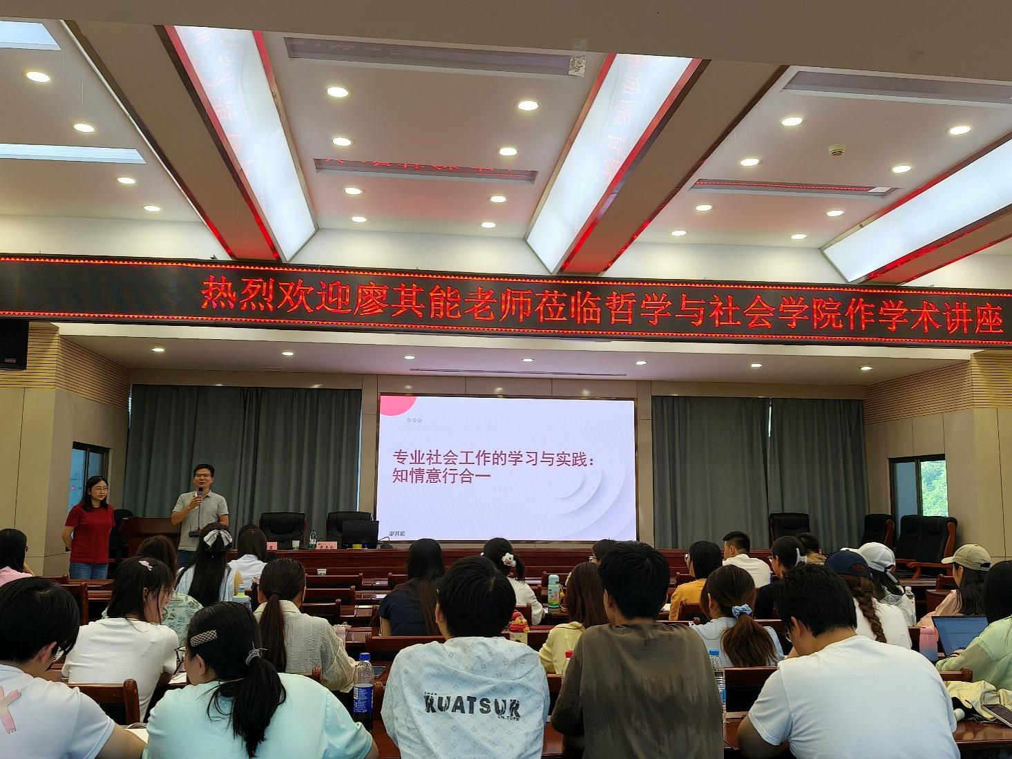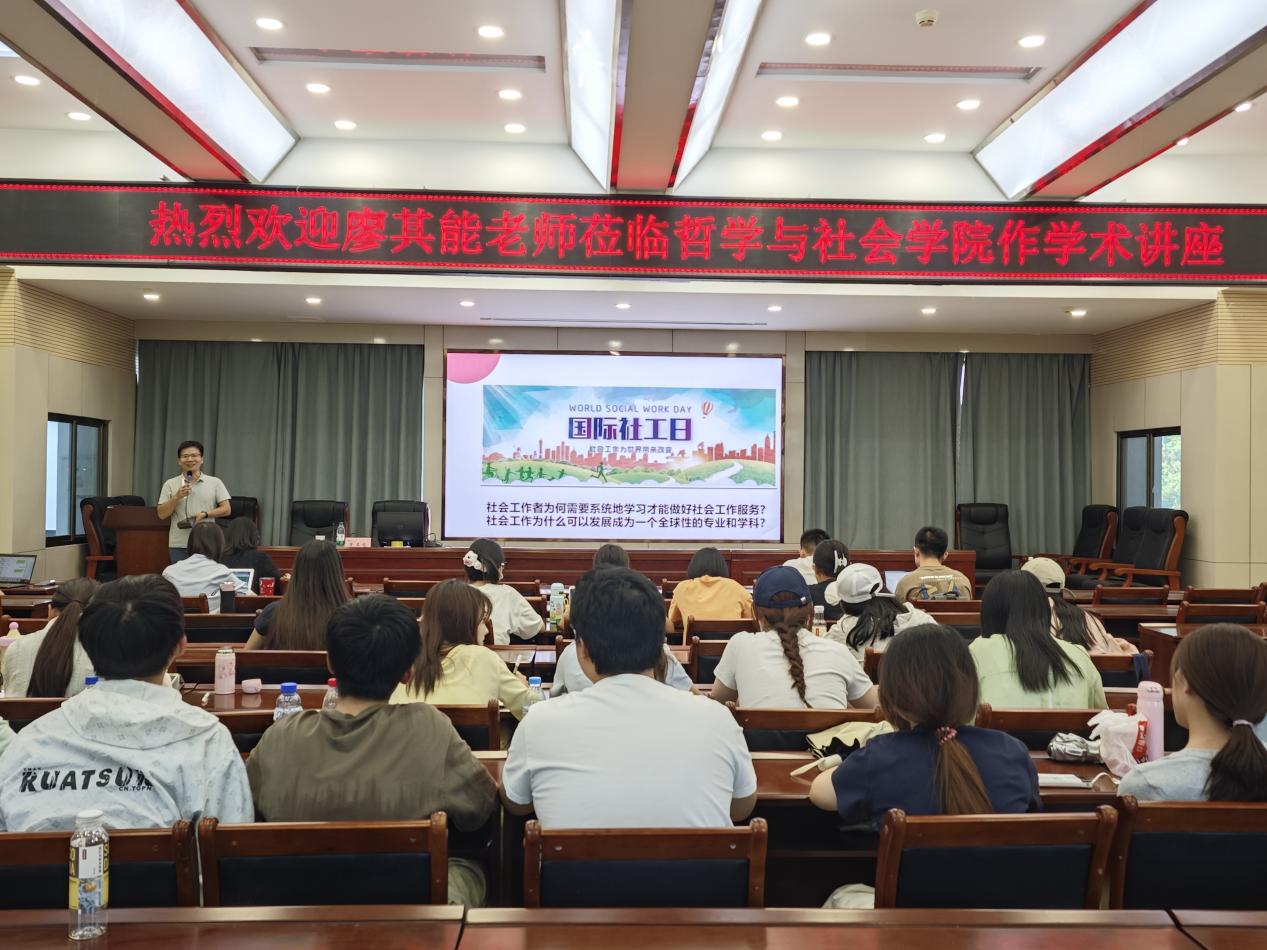 2025年6月11日19:00,中山大学廖其能博士应邀在西北师范大学10号教学楼D区四楼报告厅为鲸鱼体育直播 师生带来了题为《专业社会工作的学习与实践:知情意行合一》的学术讲座。本次讲座由徐菲老师主持,社会学与社会工作专业全体学生参加并听取了此次讲座。