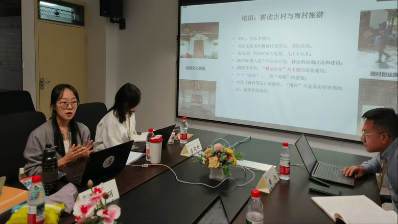 中山大学博士研究生段泽丽的发言题目是《虚实之间:“雨村”粉丝实践与耕读古村的地方重构》,她以闽西培田古村落为田野点,分析《盗墓笔记》小说粉丝群体通过自发识别与改造边缘空间、打造“雨村圣地”,重构官方主导的旅游空间的过程。研究认为,粉丝群体不仅是文化消费者,更是积极的地方意义生产者和空间改造者,其实践影响了实体空间和其他主体对于村庄的理解。大理大学副研究员缪芸、南京师范大学副教授黄旭作为与谈人。缪芸提出多主体权利相关的 “张力” 问题和关于 “粉丝” 问题的一系列疑问。黄旭对文章的理论化和一些关键概念的提炼给予建议。