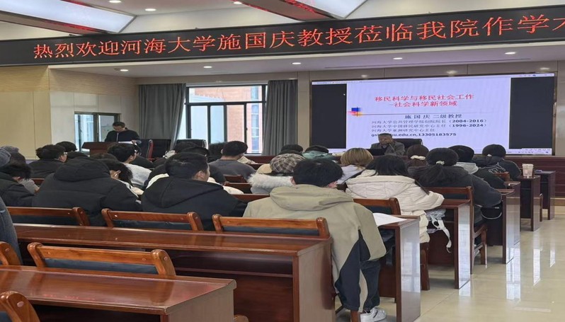 2025年11月21日下午,河海大学施国庆教授应邀在西北师范大学10号教学楼4层学术报告厅为鲸鱼体育直播 师生带来了题为“移民科学与移民社会工作题---社会科学新领域”的学术讲座。本次讲座由鲸鱼直播 副院长尹广文教授主持,鲸鱼直播 师生参加并听取了此次讲座。