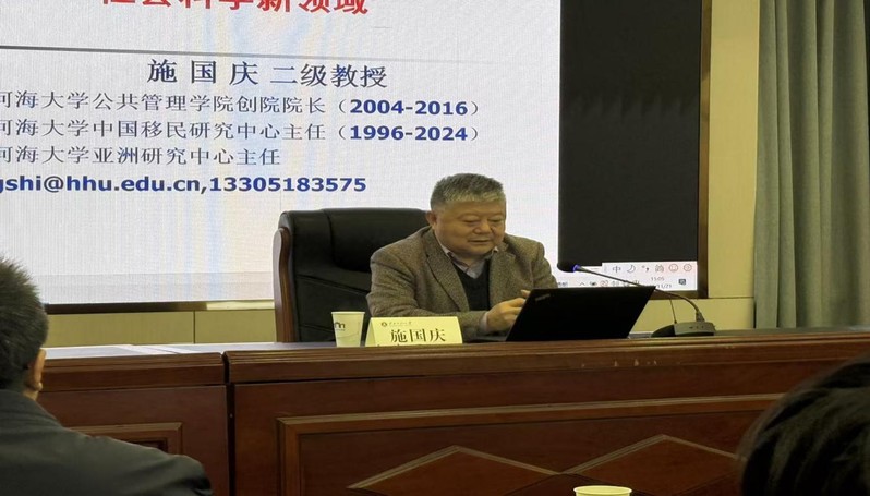 尹老师首先简要介绍了施国庆教授的研究方向及学术成果,并对其莅临致以热烈欢迎。随后,施国庆教授详细阐述了本次讲座的核心框架,围绕学科背景、移民科学与工程交叉学科属性、研究视野与对象、分支学科及核心研究内容等维度展开说明。